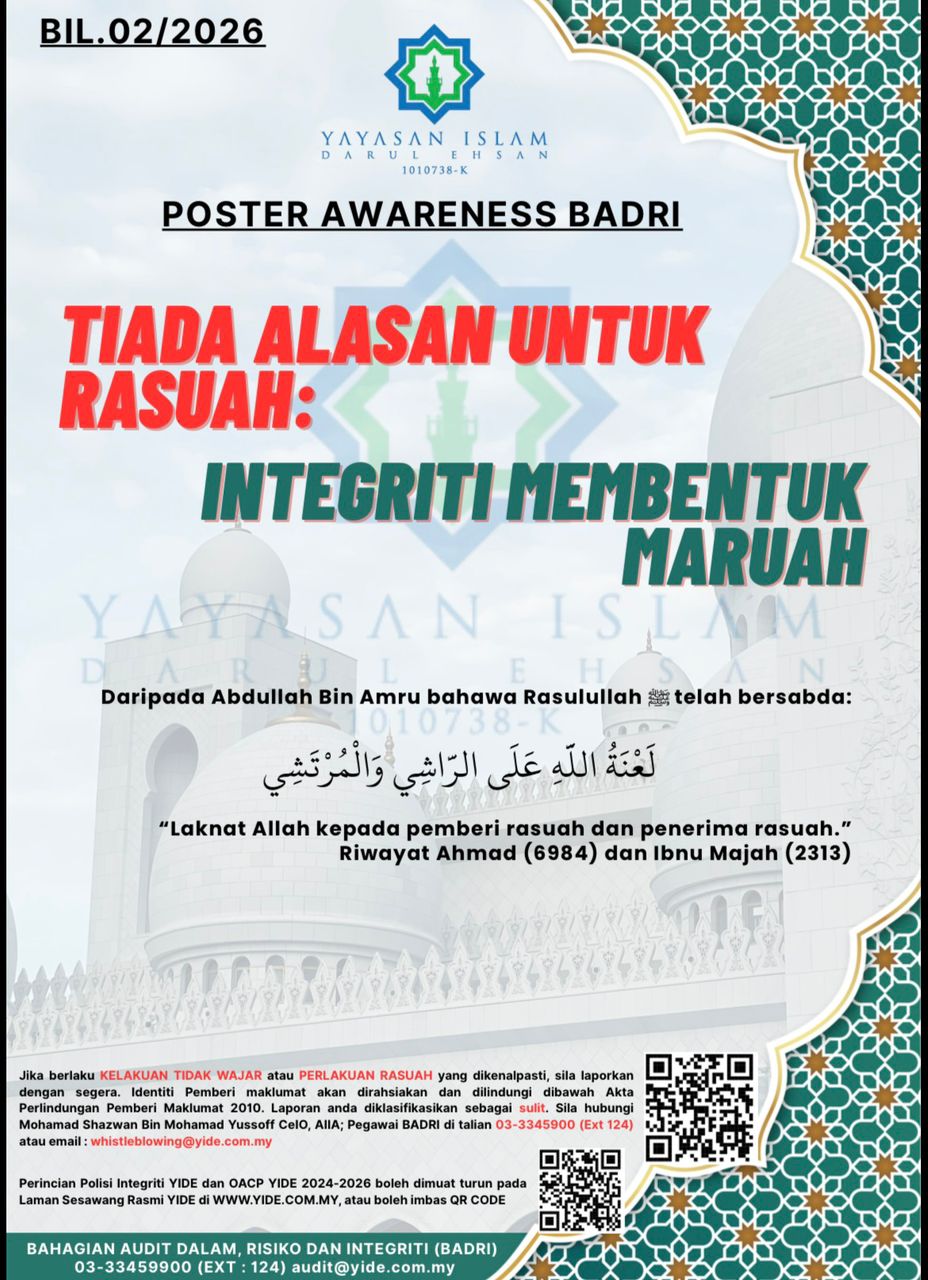 29 Julai 2025 ; Yayasan Islam Darul Ehsan (YIDE), sebuah agensi di bawah Majlis Agama Islam Selangor (MAIS), telah menjalani sesi penilaian bagi Anugerah Integriti, Governans dan Antirasuah (AIGA) Tahun 2025 oleh pegawai-pegawai penilai daripada Institut Integriti Malaysia (IIM).