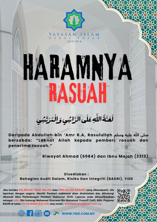 HARAMNYA RASUAH لَغَنَةُ اللَّهِ عَلَى الرَّاشِي وَالْمُرْتَشِي Daripada Abdullah bin ‘Amr R.A,Rasulullah صلى اللّٰه عليه وسلم bersabda:”Laknat Allah kepada pemberi