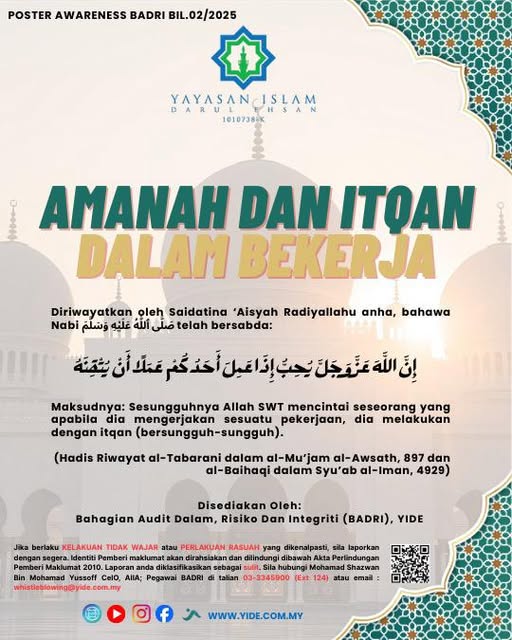 Poster Awareness BADRI Bil.03/2025 *INTEGRITI ADALAH MELAKUKAN PERKARA YANG BETUL* *WALAUPUN TIADA SIAPA YANG MELIHAT*وَالَّذِينَ هُمْ لِأَمَانَاتِهِمْ وَعَهْدِهِمْ رَاعُونَMaksudnya: Dan