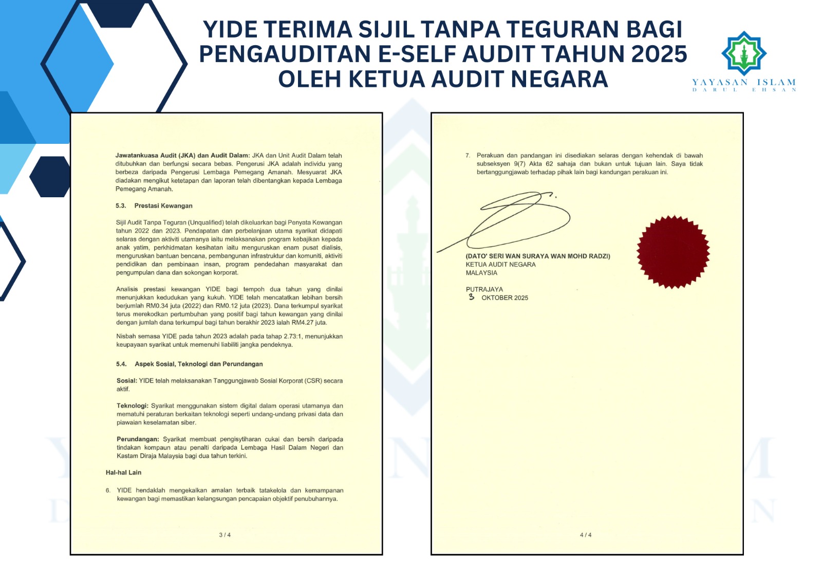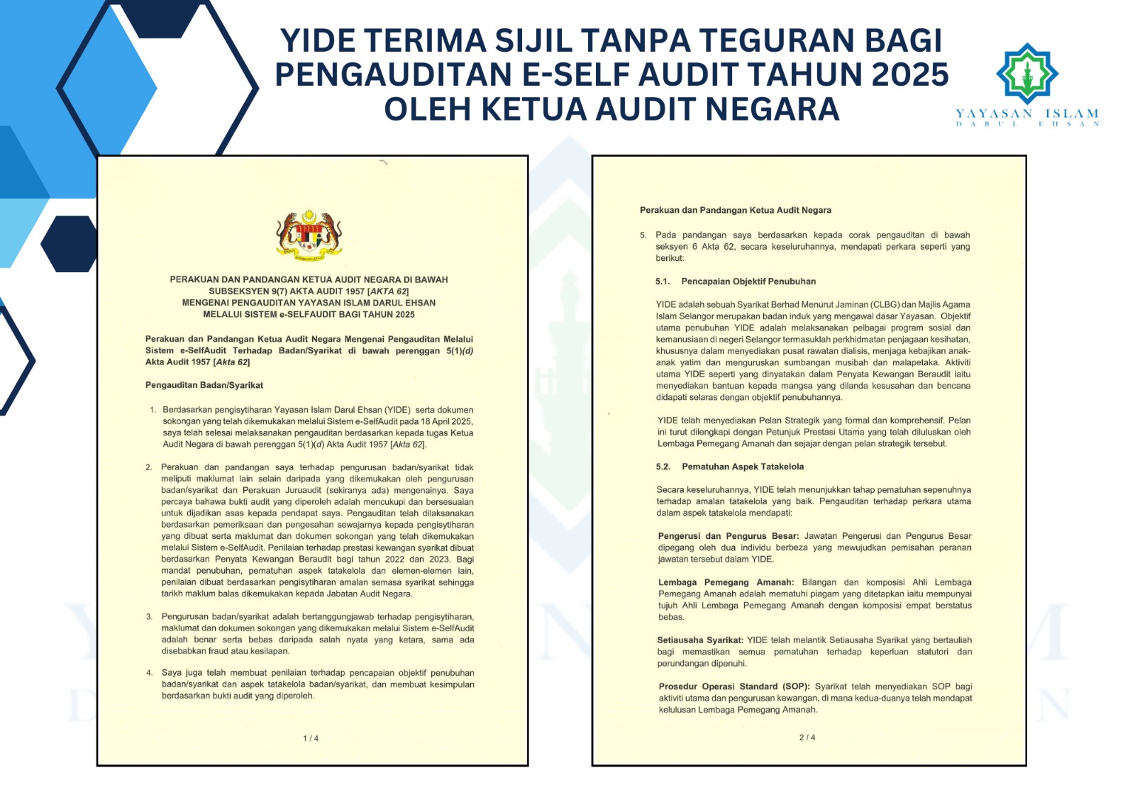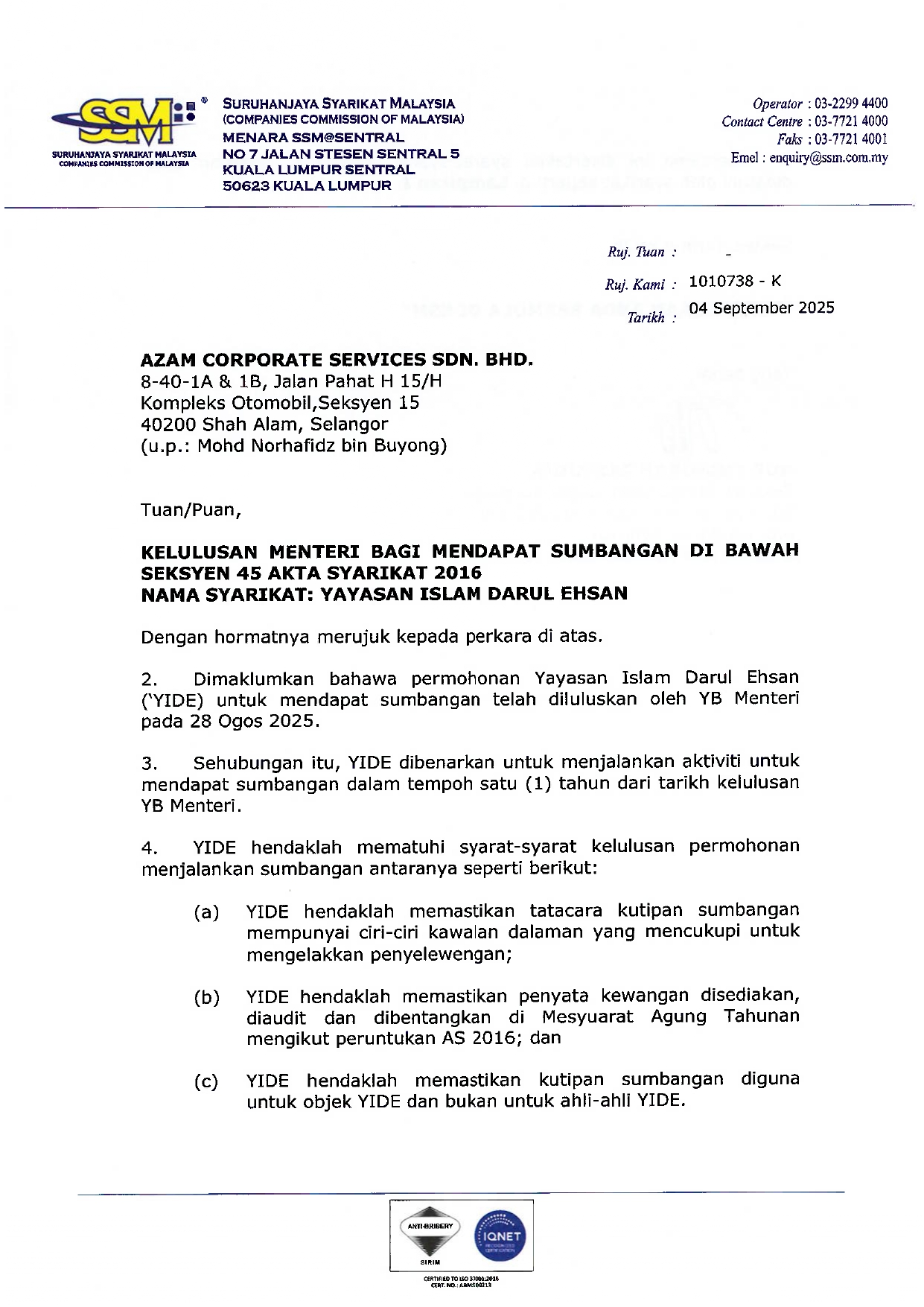 Yayasan Islam Darul Ehsan (YIDE) memperolehi Kelulusan Pendaftar/Menteri Bagi Mendapat Sumbangan Di Bawah Seksyen 45 Akta Syarikat 2016, dan dibenarkan untuk menjalankan aktiviti untuk mendapatkan sumbangan dalam tempoh satu (1) tahun dari tarikh kelulusan Pendaftar/Menteri pada 28 Ogos 2025.