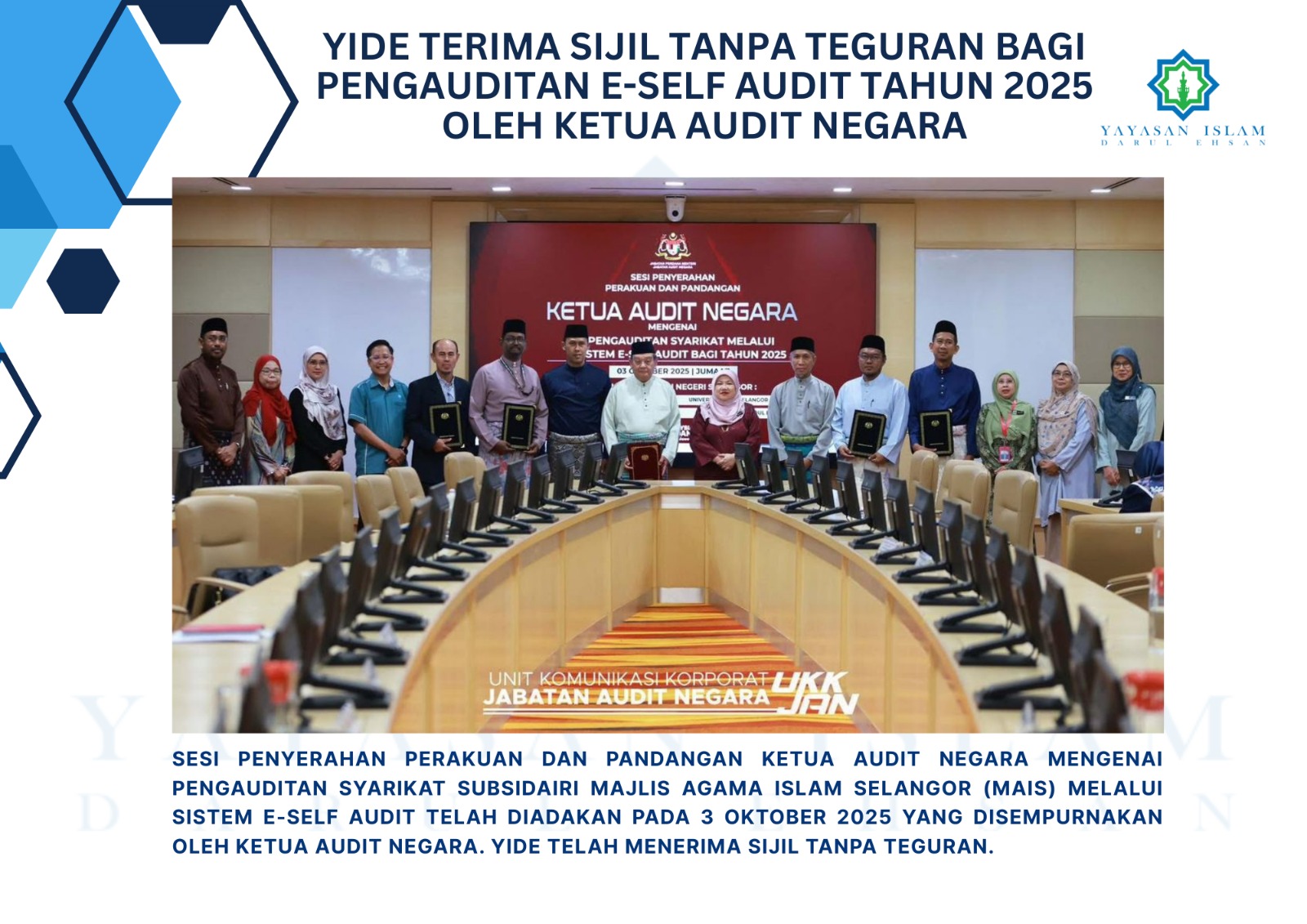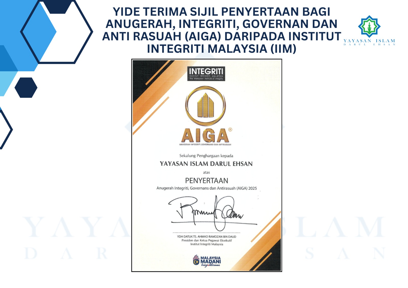 Yayasan Islam Darul Ehsan (YIDE) memperolehi Sijil Penghargaan Sebagai Rakan Strategik Jabatan Kebajikan Masyarakat Tahun 2025 daripada Kementerian Pembangunan Wanita, Keluarga Dan Masyarakat pada 1 Julai 2025.
